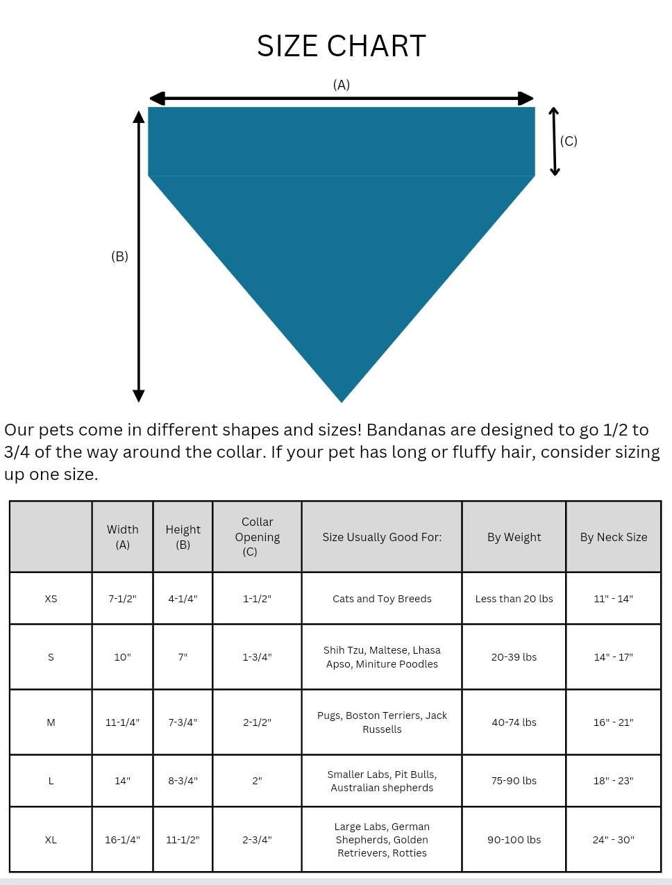 📍Suggested Dog Bandana Sizes: Our pets come in different shapes and sizes! Bandanas are designed to go 1/2 to 3/4 of the way around the collar. If your pet has long or fluffy hair, consider sizing up one size.